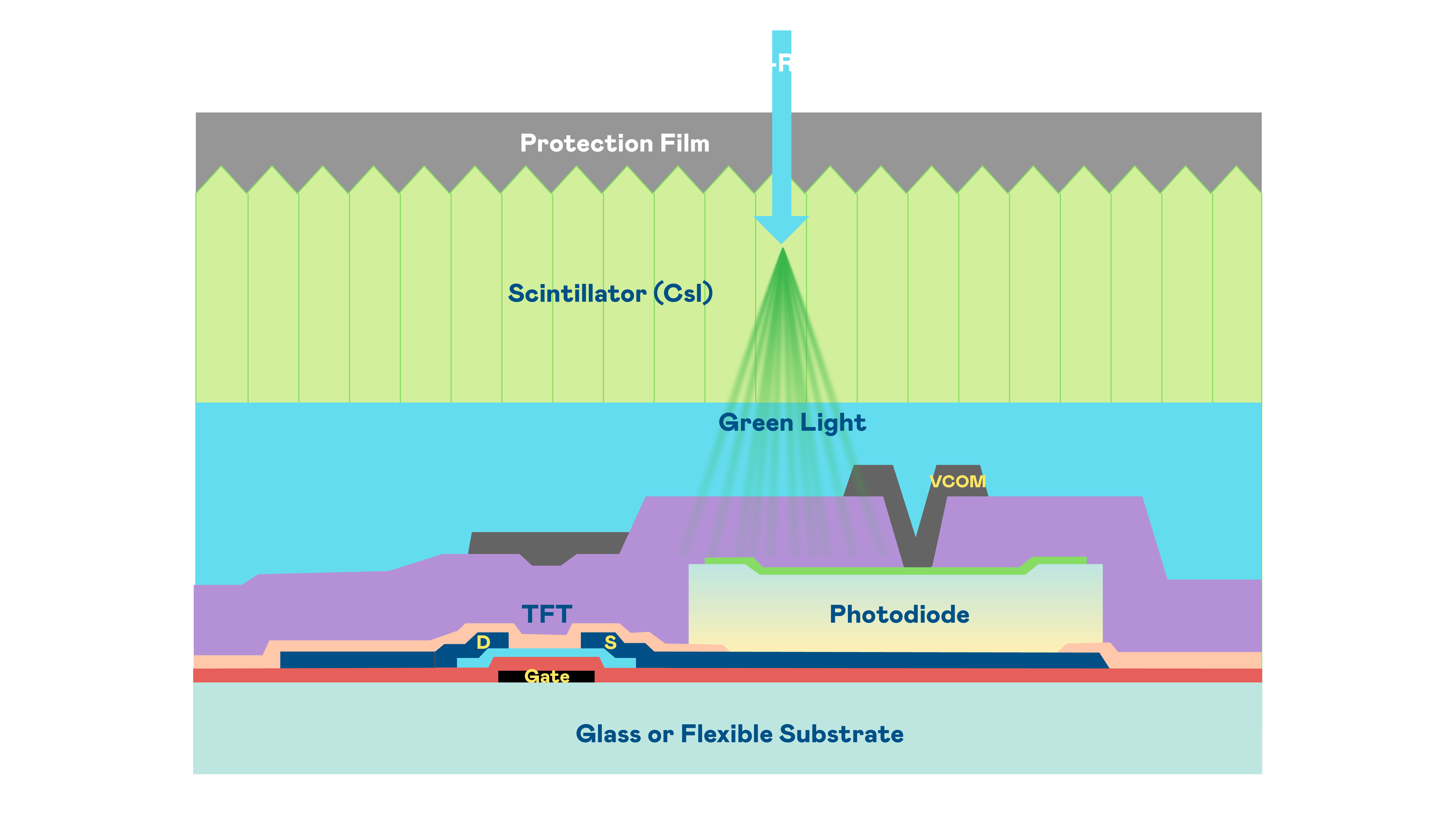 创世大发的X光影像感測陣列使用薄膜電晶體 (TFT) 作為每個像素的讀取開關,搭配光電二極體(Photodiode)的光電轉換元件,用以感測X光影像訊號。